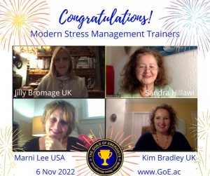 It acknowledges that the energy of one person effects the energy of another and so it suggests improving our own energy flow and then improving the energy flow of the system . This puts us in the driving seat as we figure out what we can do to improve our energy flow . For me listening to Tina Turner “ simply the best “creates a huge energy surge that propels me to the +5 state that is seen as the starting point energy state needed to be expand possibilities . It offers a stress scale so we can identify where we are on the stress table It guides us in recognising our different feelings thoughts and behaviours depending on where we are on the stress scale. Then we compile a list of ways to improve our energy flow . Completing that exercise alone empowers us to take charge of our energy flow It encourages us to tune into our “heart “ energy our reason for being our soul energy It differentiates between who we are in the here and now in this moment and the parts of us involved in past and future events to come , This gives us a space between who we are in this moment and the part of us involved in a past trauma or the part of us going into the future. It identifies love energy as the most powerful force for change in any system And it teaches us how to bring this force into our lives any time in any situation The modern stress management course is truly a life changing course that puts us in touch with our own superpower. Helen Mccrarren, Distance Learning Graduate Martina Barrett Nanouschka De Wilde, GoE Trainer